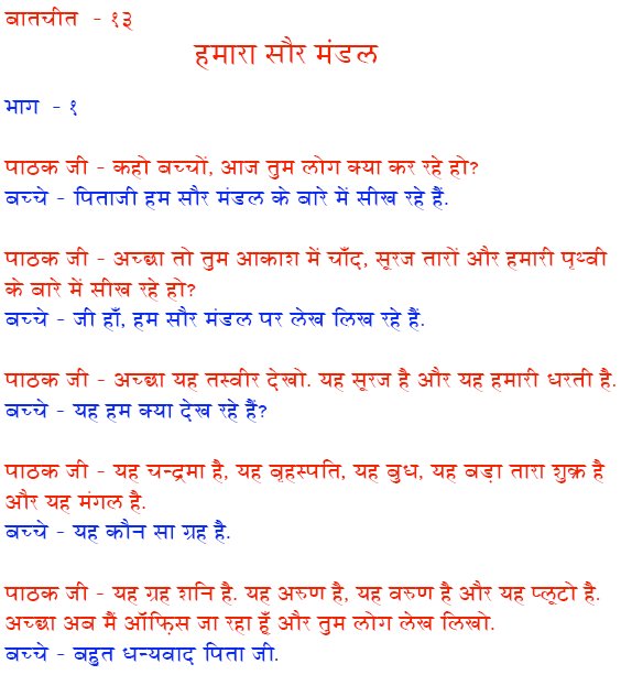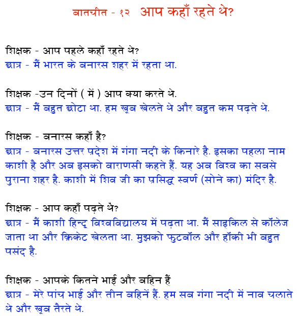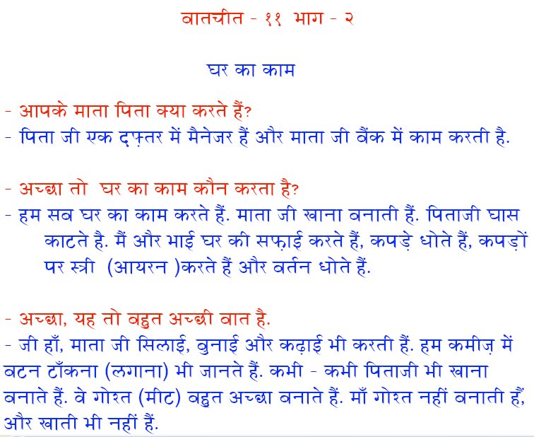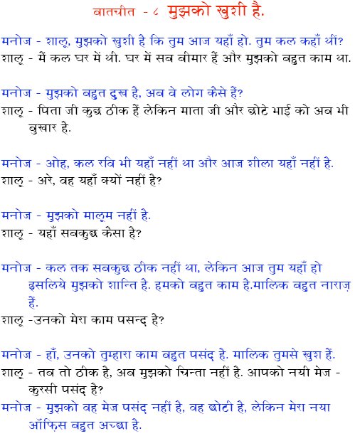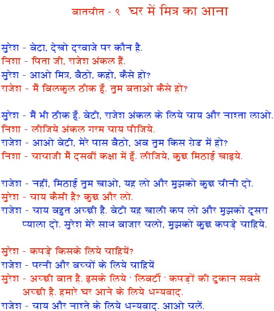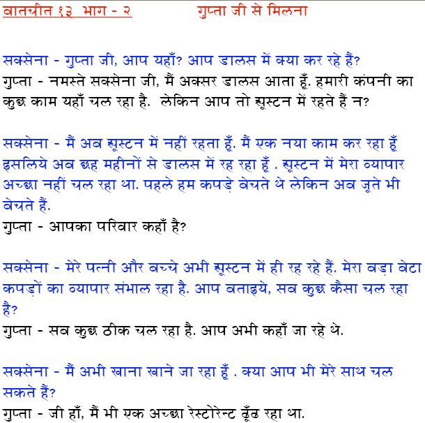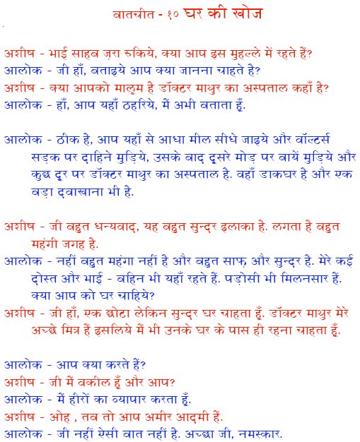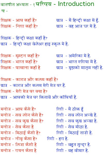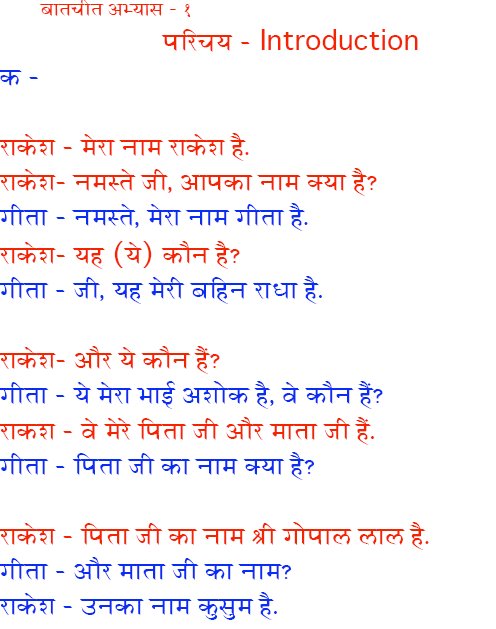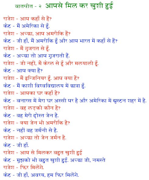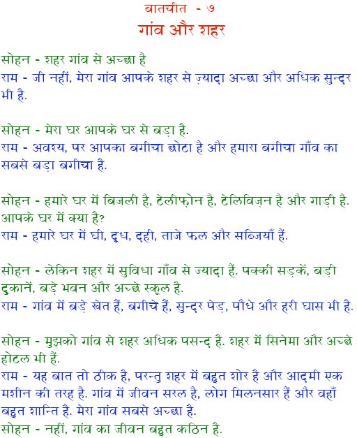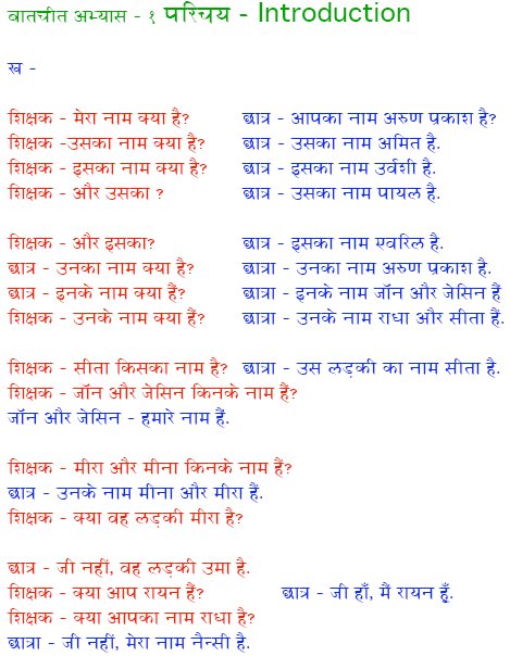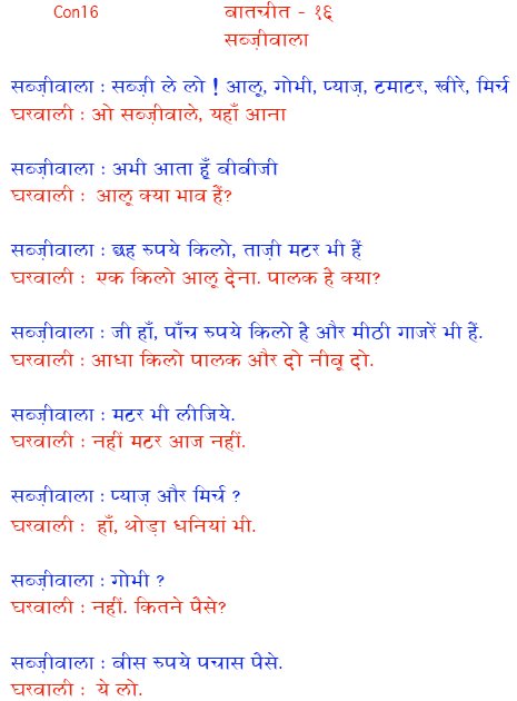 Hindi Conversations This is the repository of several practice conversations. They are derived from the textbook Namaste Jii by Shri Arun Prakash. These practice lessons are recorded by Shri Arun Prakash and Smt Pushpa Prakash along with their students. These are provided here with the explicit permissions from them for strictly educational purposes. Please do leave us feedback on any of the conversation by sending email to hindiclass@hindisangam.org, or by leaving the comments at the end of this page. Please specify the conversation Title when submitting the feedback. Each conversation has an audio and a text transcript. You can follow the script, listen to the audio and practice yourself. Pronunciations of Hindi Vowels https://www.hindisangam.org/wp-content/uploads/2025/11/Vowels.mp3 Pronunciations of Hindi Consonants https://www.hindisangam.org/wp-content/uploads/2025/11/Cons.mp3 Conversation #1 Introductions A (क) https://www.hindisangam.org/wp-content/uploads/2025/11/DiaI1.mp3 Conversation #1 Introductions B (ख) https://www.hindisangam.org/wp-content/uploads/2025/11/DiaI2.mp3 Conversation #1 Introductions C (ग) https://www.hindisangam.org/wp-content/uploads/2025/11/DiaI3.mp3 Conversation #1 Introductions D (घ) https://www.hindisangam.org/wp-content/uploads/2025/11/DiaI4.mp3 Conversation #1 Introductions E (च) https://www.hindisangam.org/wp-content/uploads/2025/11/DiaI5.mp3 Conversation #2 - आपसे मिलकर खुशी हुई https://www.hindisangam.org/wp-content/uploads/2025/11/Dia2.mp3 Conversation #3 - आप कैसे हैं? https://www.hindisangam.org/wp-content/uploads/2025/11/Dia3.mp3 Conversation #4 - हमारा बगीचा छोटा है https://www.hindisangam.org/wp-content/uploads/2025/11/Dia4.mp3 Conversation #5 - हमारा नया स्कूल https://www.hindisangam.org/wp-content/uploads/2025/11/Dia5.mp3 Conversation #6 - अच्छा होटल https://www.hindisangam.org/wp-content/uploads/2025/11/Dia6.mp3 Conversation #7 - गाँव और शहर https://www.hindisangam.org/wp-content/uploads/2025/11/Dia7.mp3 Conversation #8 - मुझको खुशी है https://www.hindisangam.org/wp-content/uploads/2025/11/Dia8.mp3 Conversation #9 - घर में मित्र का आना https://www.hindisangam.org/wp-content/uploads/2025/11/Dia9.mp3 Conversation #10 - घर की खोज https://www.hindisangam.org/wp-content/uploads/2025/11/Dia10.mp3 Conversation #11 - Part 1 - तुम क्या करते हो? https://www.hindisangam.org/wp-content/uploads/2025/11/Dia11-1.mp3 Conversation #11 - Part २ - घर का काम https://www.hindisangam.org/wp-content/uploads/2025/11/Dia11-2.mp3 Conversation #11 - Part 3 - सब कुछ कैसा होता है https://www.hindisangam.org/wp-content/uploads/2025/11/Dia11-3.mp3 Conversation #12 - आप कहाँ रहते थे? https://www.hindisangam.org/wp-content/uploads/2025/11/Dia12.mp3 Conversation #13 - Part 1 - हमारा सौर मंडल https://www.hindisangam.org/wp-content/uploads/2025/11/Dia13-1.mp3 Conversation #13 - Part 2 - गुप्ता जी से मिलना https://www.hindisangam.org/wp-content/uploads/2025/11/Dia13-2.mp3 Conversation #14 - खेल और खिलाड़ी https://www.hindisangam.org/wp-content/uploads/2025/11/Dia14.mp3 Conversation #15 - फल की दुकान https://www.hindisangam.org/wp-content/uploads/2025/11/Dia15.mp3 Conversation #16 - सब्जीवाला https://www.hindisangam.org/wp-content/uploads/2025/11/Dia16.mp3